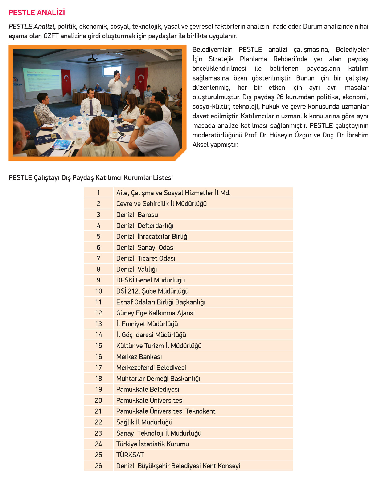 The municipality has performed its PESTLE analysis with the participation of its stakeholders. The stakeholders include Pamukkale University, Southern Aegean Development Agency, and the City’s Migration Authority, all of whom can provide important insights for the plan.