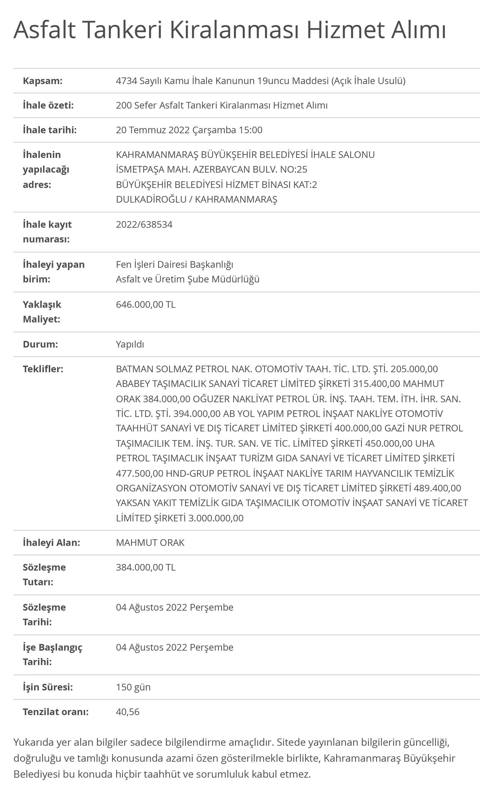 The municipality shares information regarding bids on its web site. This information includes names of bidders and winners, as well as the monetary amount of the final bid.